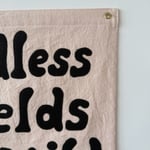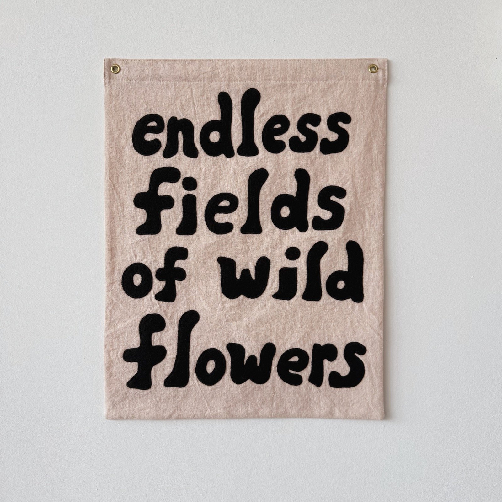 Hand-drawn/cut black felt lettering, machined stitched onto a warm pale pink linen.